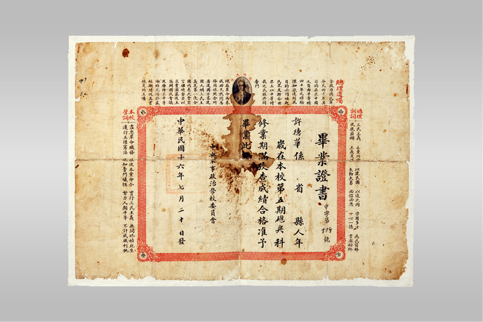 Xu Dehua’s (Xu Guangda) Diploma from Huangpu Military Academy